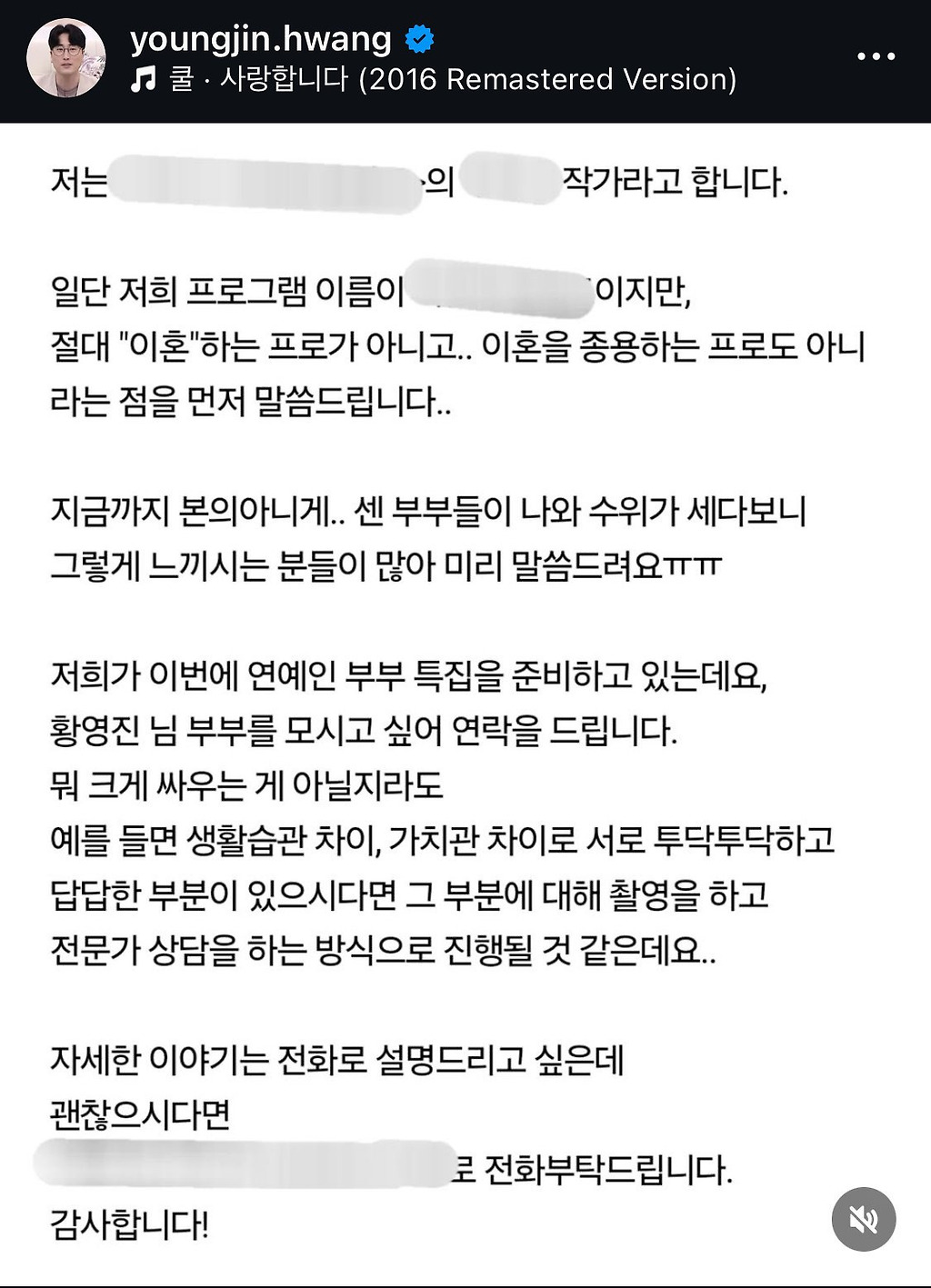 이혼관련 부부예능 섭외연락 내용을 공개한 개그맨