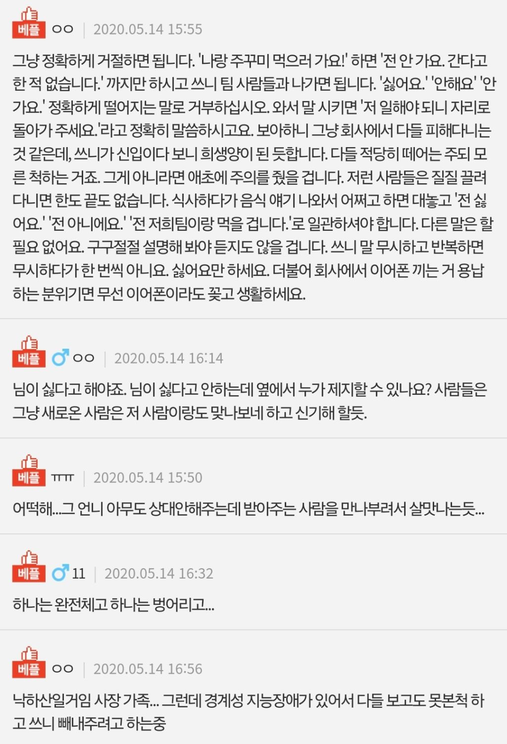 2. 말도 안섞으시는 언니랑은 그 언니분은 경력이 10년이 넘는분이고 이 분은 30대에 첫 직장으로 온건데 업무 가르쳐주다가 이건 이렇게 하면 안되죠 지난번에 알려드렸는데~ 했더니 그래도 내가 언니인데 왜 화를내요? 라고 했다고 함. 그 뒤로 몇번 비슷하게 부딪히는데 문제는 그러고나서 마치 아무 일도 없다는 듯이 같이 밥 먹으러 가자고 말을 걸어와서 홧병이 나서 완벽히 무시하기 시작하셨다고함. 근데 무시당하는것도 한 2달정도 더 지나서 깨달았다고 하셨음..