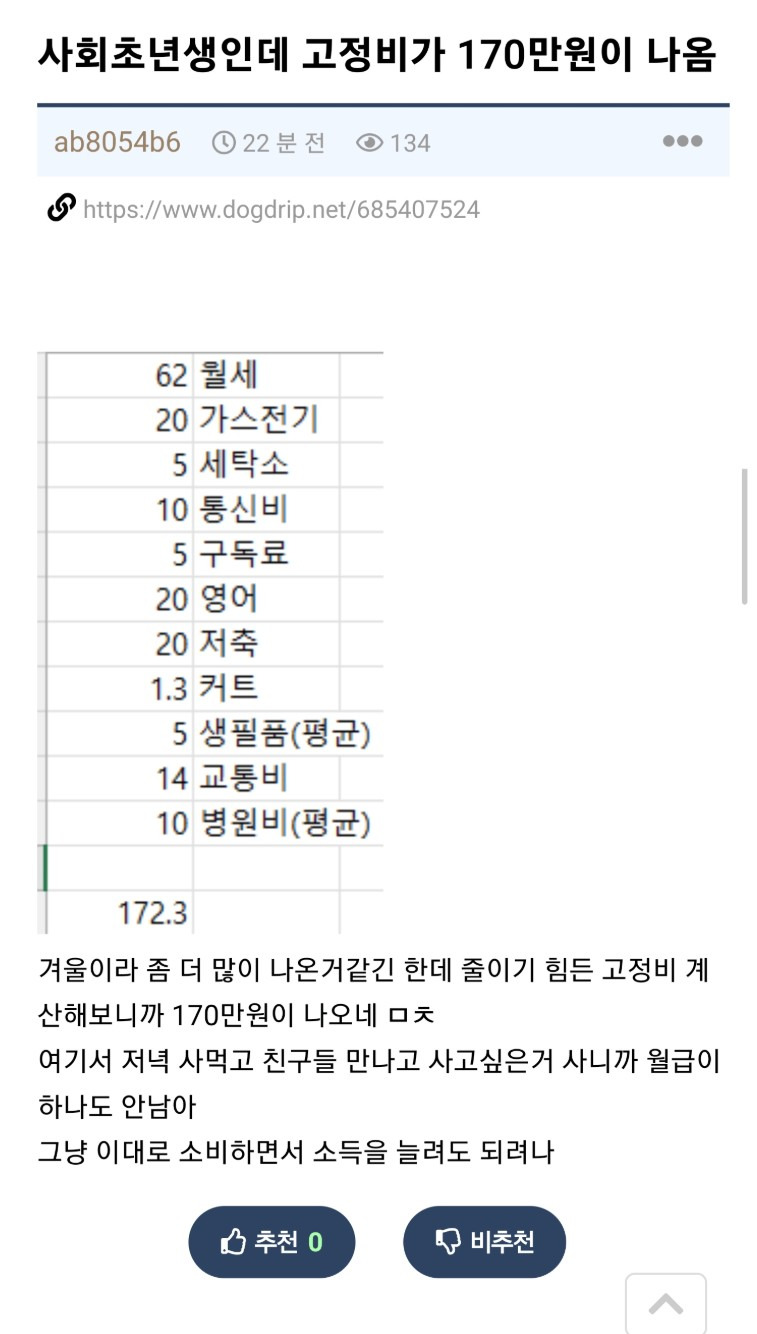통신비 = 인터넷 포함 가스 전기세 20만원 = 방 2개 옥탑 투룸 겨울에 많이 나옴영어 = 필요하니까 하는 것 줄이기 불가 세탁소 = 신발,수선,드라이 클리닝 병원비 = 줄이기 불가 월세 62 = 회사가 강남이라 불가알뜰폰 불가 = 약정 남아서 못함 구독료 = AI,쿠팡,유튜 프리미엄,넷플