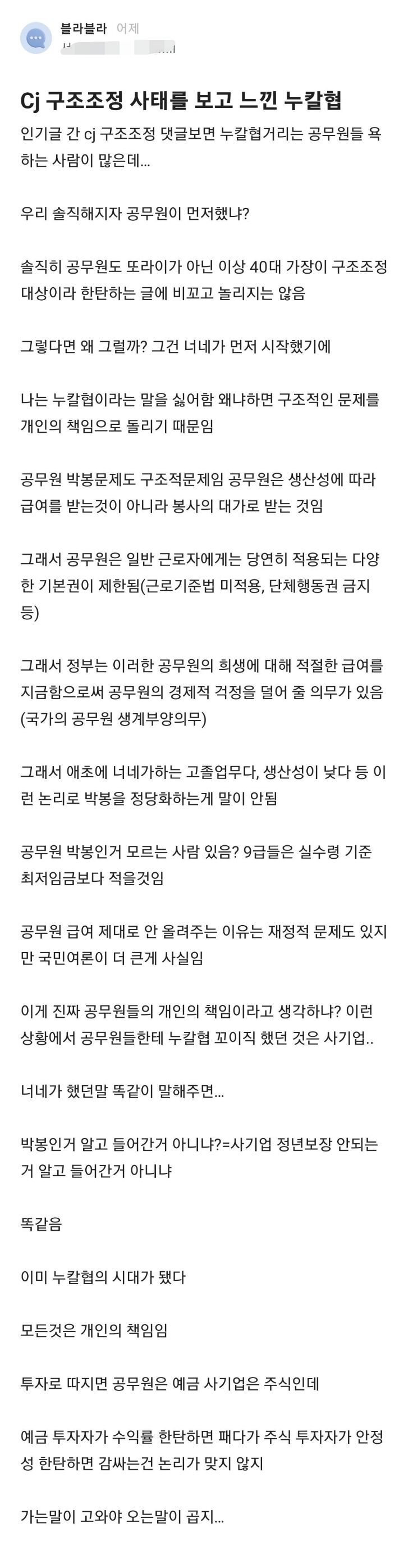 CJ 구조조정 이후 누칼협 난리난 블라인드 본 공무원