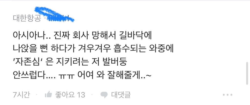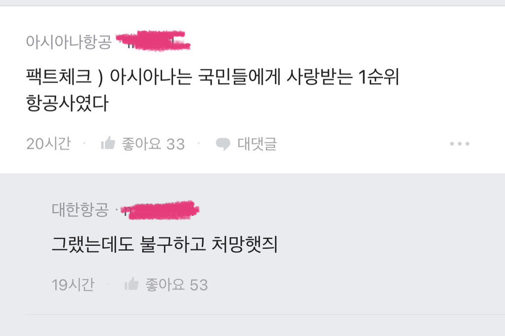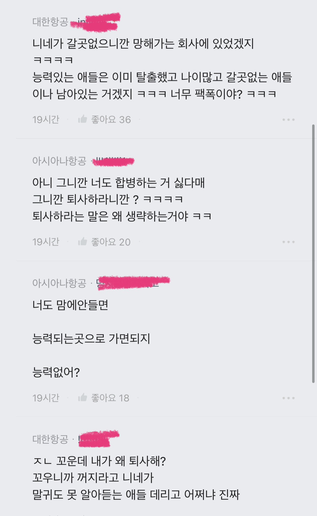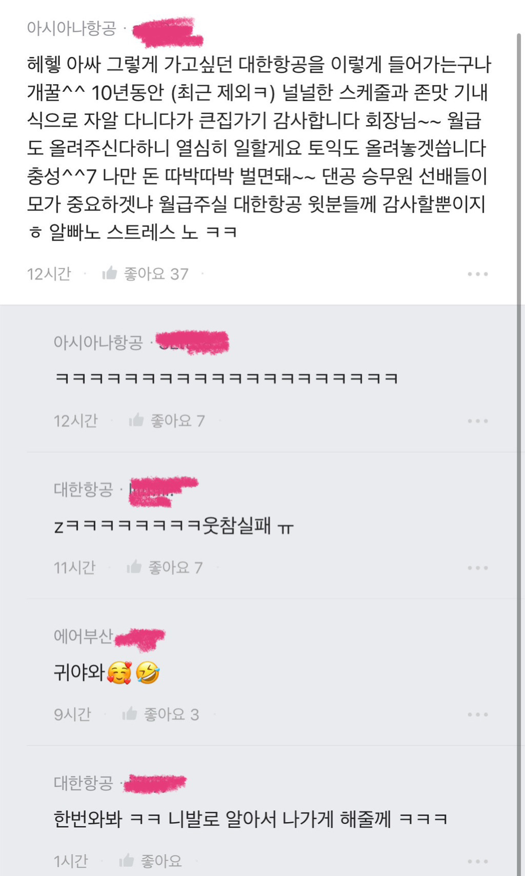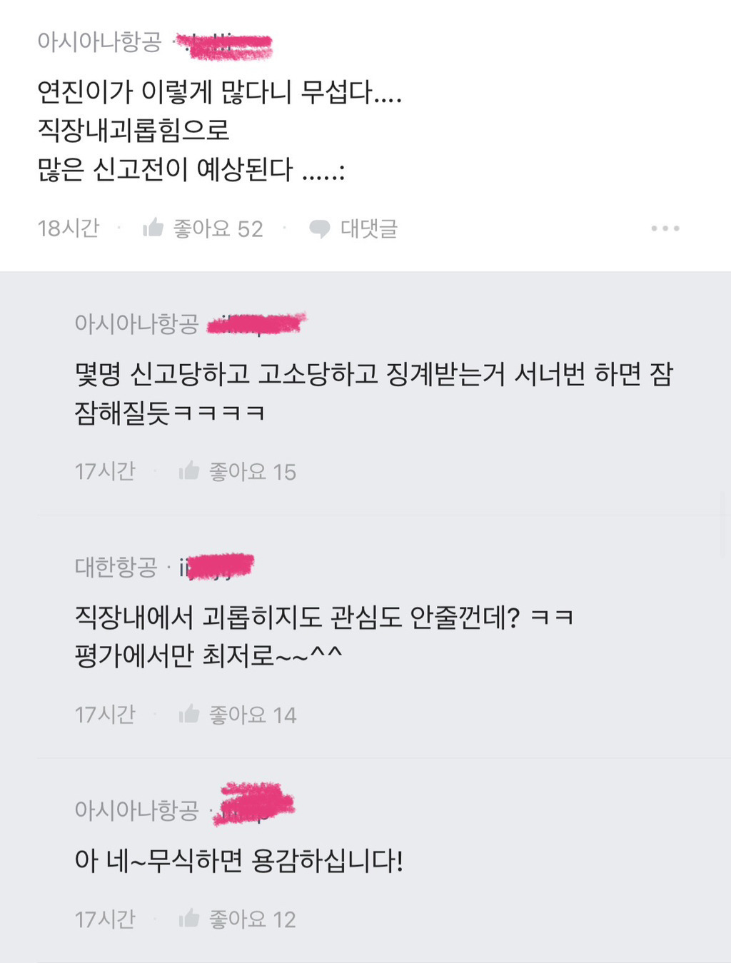 합병문제로 블라인드에서 싸우고 있는 대한항공 아시아나 직원들