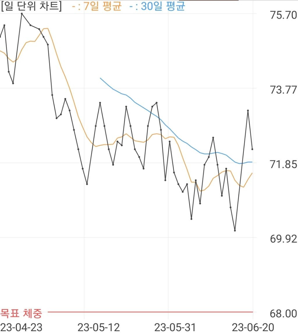 사작은 86이였는데 독하게 빼다가 귀찮아져서 이제 걍 먹으니까 와리가리만하네운동 계단걷기.산책밖에안하고 식이조절 귀찮아서 걍 1일 1식함. 술먹는날 좀 먹는편이라 저렇게 훅 찌고 가라앉음 반복ㅋㅋ
