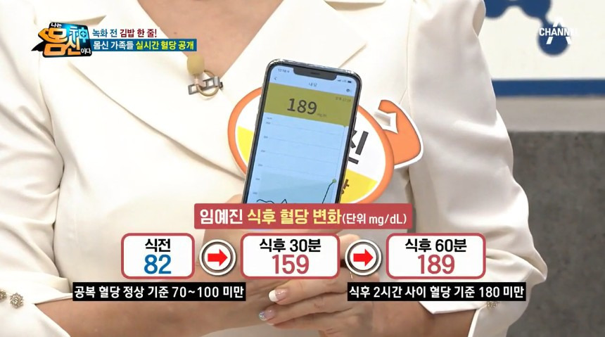 같은 일반인 출연진 임예진씨도 김밥한줄 먹은 후 혈당 189