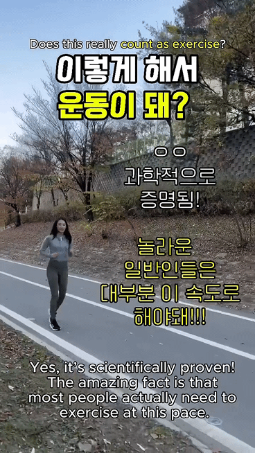 이정도의 속도임 영상으로 보면 생각보다 더 느린 느낌!러닝초보나 중장년층, 무릎이 약한 사람들, 체중이 많이 나가는 사람들이 해도 부담이 덜가고 러닝만큼 효과가 좋은 운동이라고 함