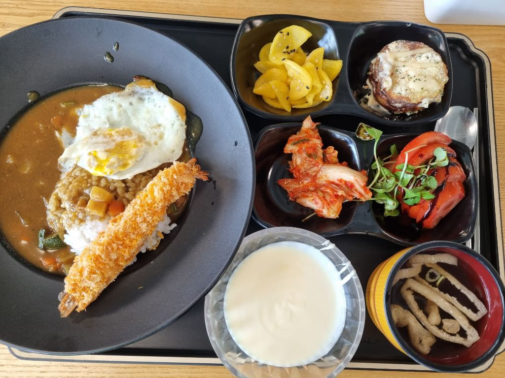 통새우튀김이 올라간 에비카츠커리파마산치즈오븐감자구이토마토유자청무침쫄단무지배추김치망고요거트2번 잘 안 뜨는데 오븐감자구이 넘 맛있어서 2개나 먹음오늘 진짜 맛의 조합 끝나줌
