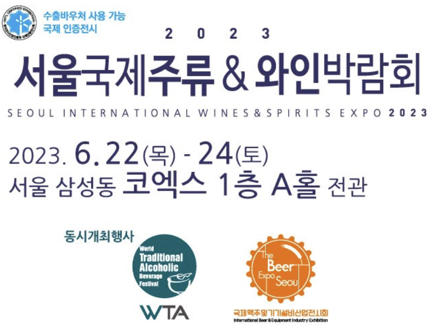 2023. 6. 22(목) ~ 24(토), 코엑스 1층 A홀 전관, 대한민국 최대 규모 종합주류박람회로 주류산업의 트렌드를 선도하고 기업들에게 다양한 홍보 기회를 제공
