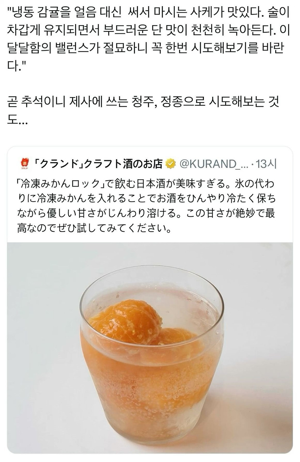 냉동귤은 위스키에도 잘 어울림. 얼음 대신 넣어 온더락스로 마시면 귤에 붙어있는 귤락에 식이섬유, 비타민 C와 항균·항바이러스 작용을 하는 비타민 P가 풍부하게 함유돼있어 건강에 이로운 걸 함께 먹는다는 위약효과도 있다(고 믿는 술꾼). 출처 트위터 : https://x.com/zidory/status/1858541767366500778