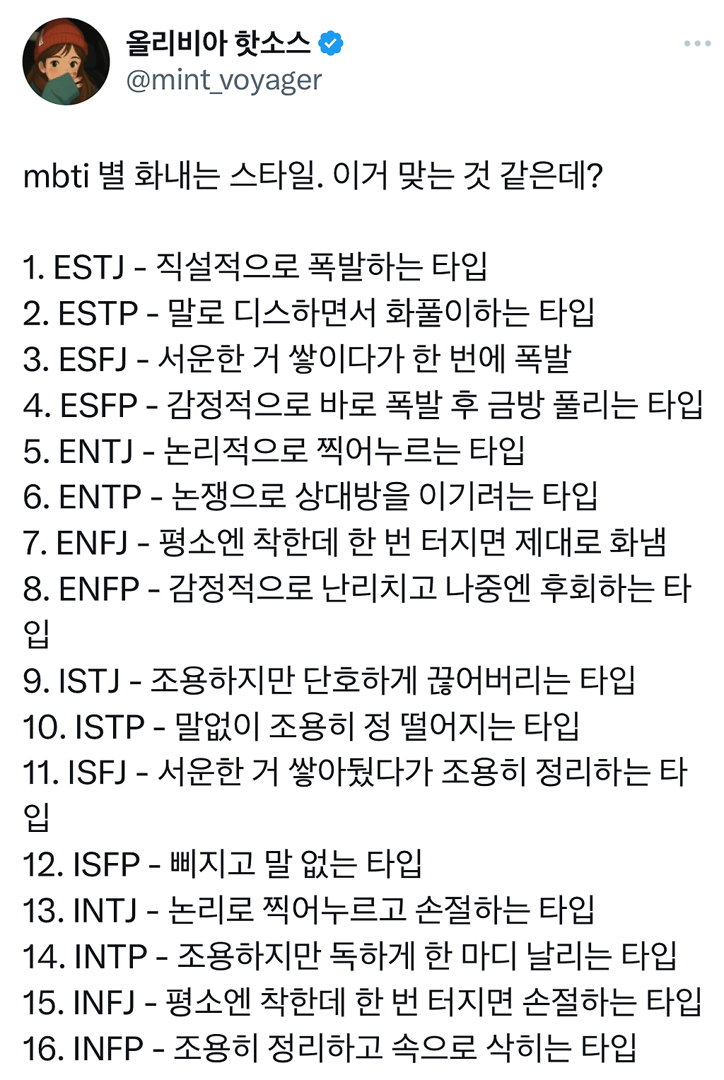 mbti 별 화내는 스타일. 이거 맞는 것 같은데? 1. ESTJ - 직설적으로 폭발하는 타입 2. ESTP - 말로 디스하면서 화풀이하는 타입 3. ESFJ - 서운한 거 쌓이다가 한 번에 폭발 4. ESFP - 감정적으로 바로 폭발