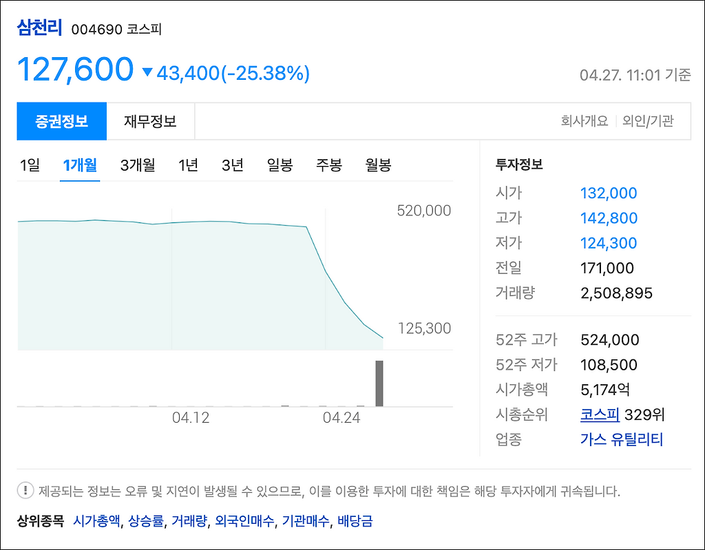 조작대상 종목중 하나인 삼천리의 주가현황입니다.