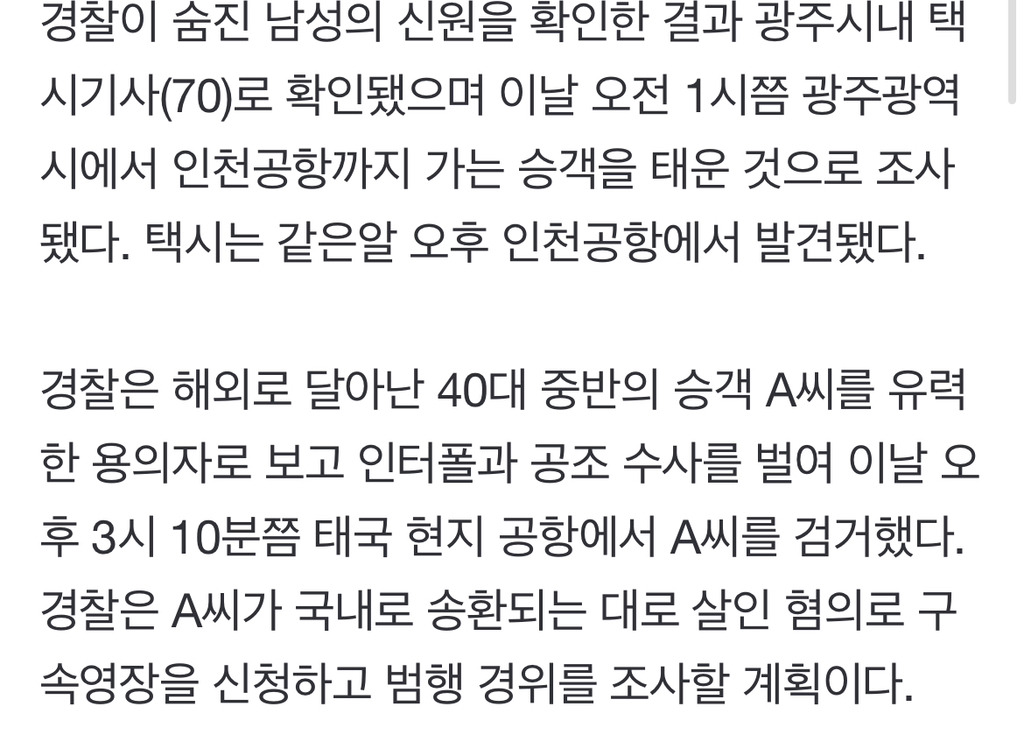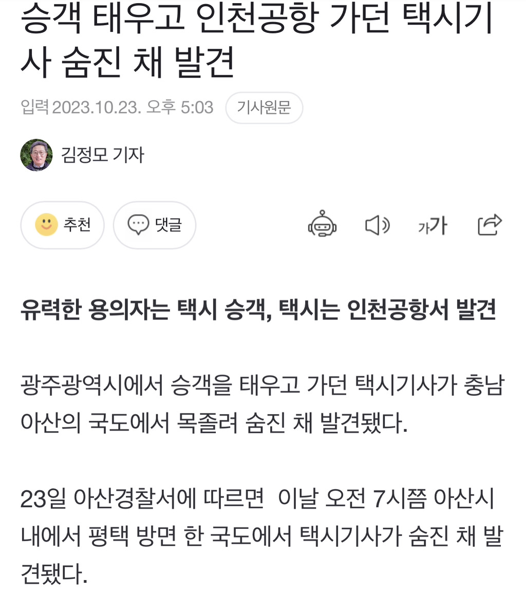 광주광역시에서 승객을 태우고 가던 택시기사가 충남 아산의 국도에서 목졸려 숨진 채 발견됐다. 23일 아산경찰서에 따르면 이날 오전 7시쯤 아산시내에서 평택 방면 한 국도에서 택시기사가 숨