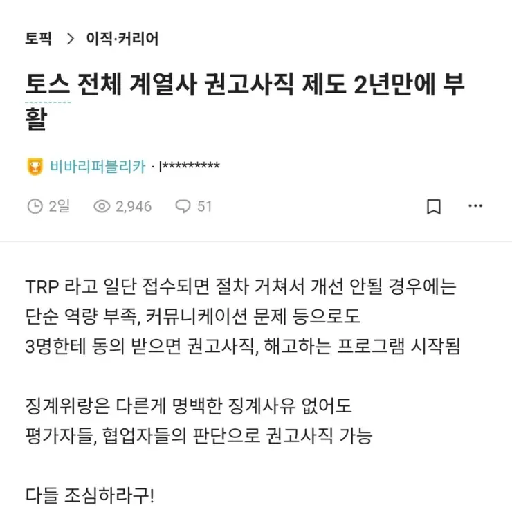 토스, 3명에게 동의받으면 해고당하는 프로그램 시작