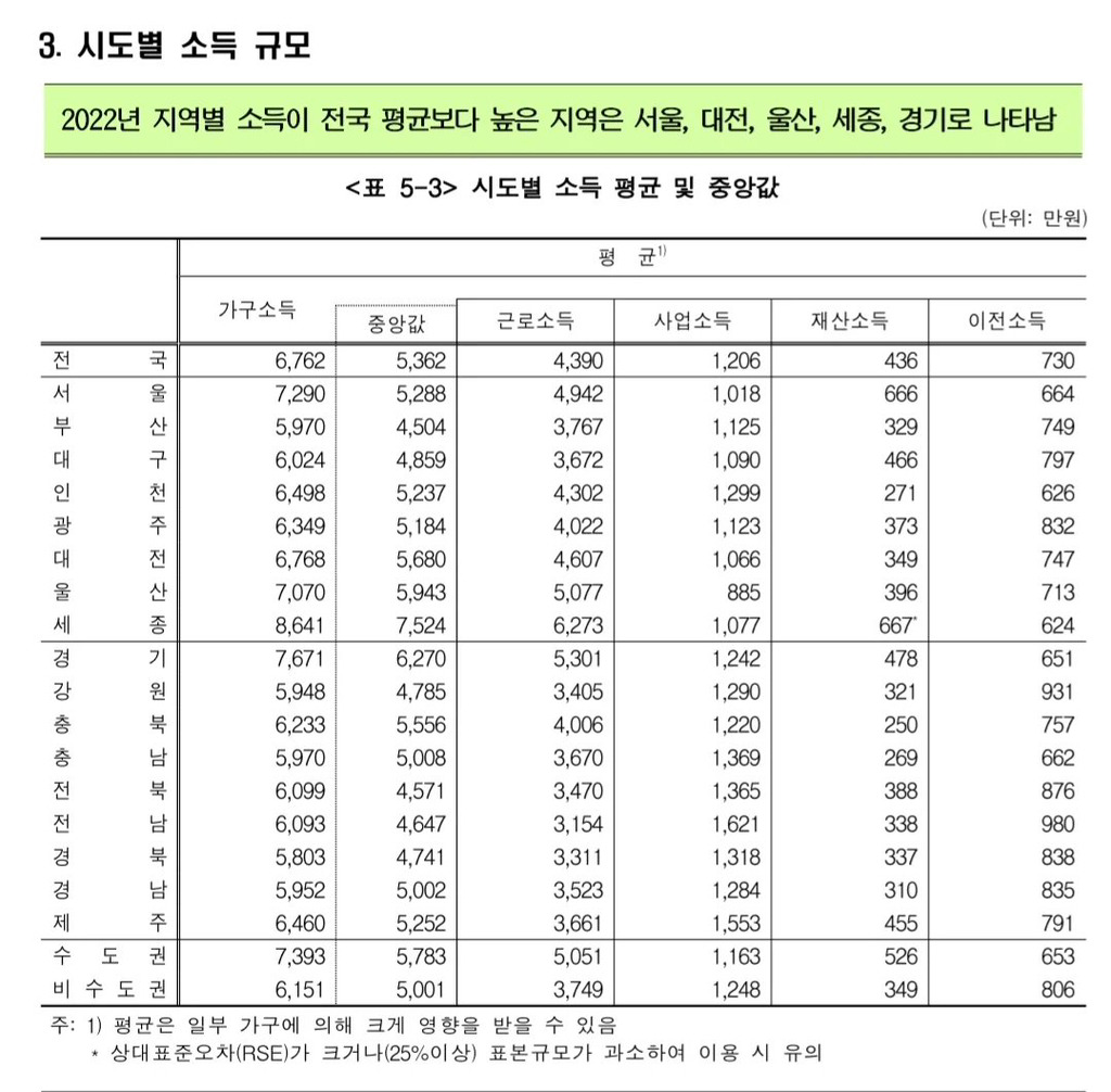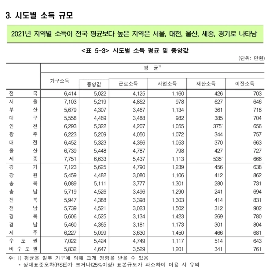 한국은행이 오늘 발표한 지역별 소득규모 평균 및 중앙값