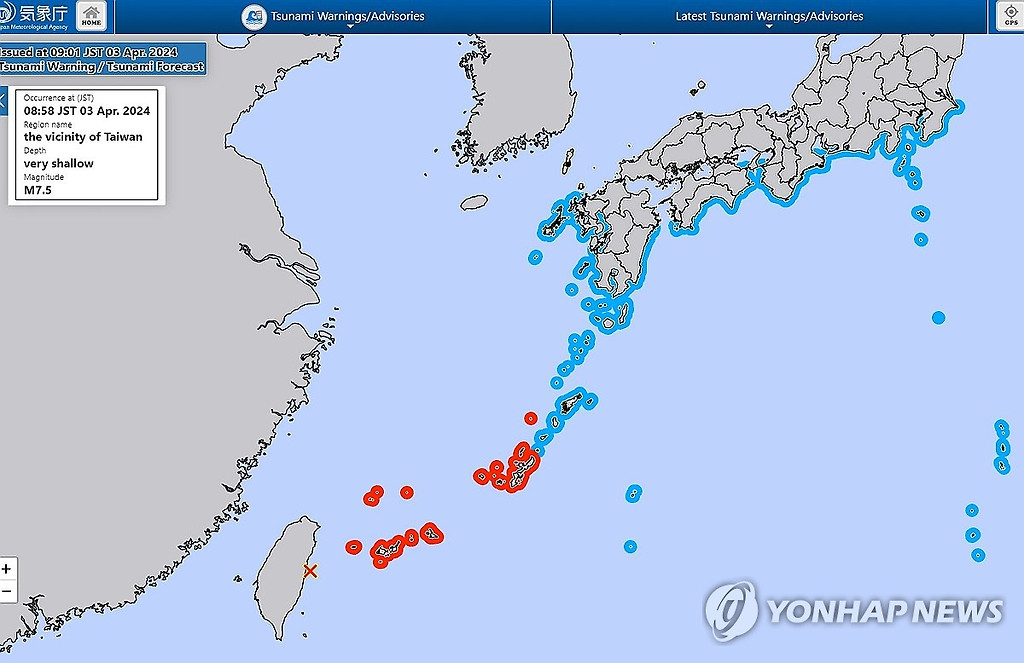 이 영향으로 대만은 물론 지진 발생 지역에서 700여㎞ 떨어진 일본 오키나와에도 최대 3m 높이의 쓰나미 경보가 발령됐다.