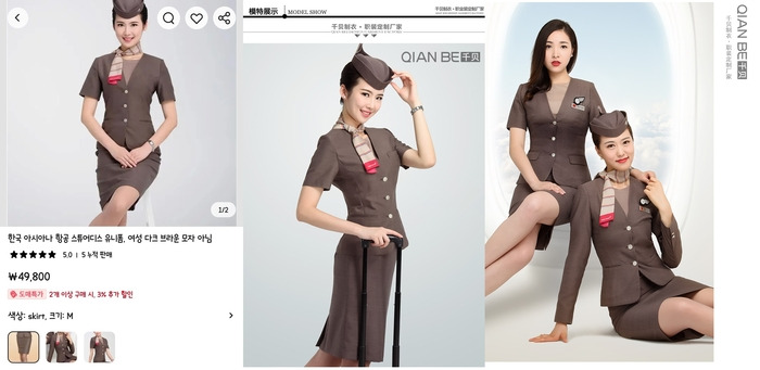8일 본지 취재를 종합한 결과 중국 이커머스 기업 알리익스프레스에 입점한 '시안 베이 디자인 의복 공장(QIAN BEI DESIGN GARMENT FACTORY)'은 고동색 계열의 아시아나항공 객실 승무원 유니폼을 판매하고 있는 것으로 확인됐다. 또 다른 입점 업체는 대한항공 승무원들이 입는 하늘색 실크 상의와 하얀색 자켓 등을 올려놨다.