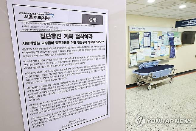 (서울=연합뉴스) 오진송 기자 = 서울대병원 교수들이 전공의 사태 해결 등을 요구하며 17일부터 무기한 휴진에 들어간다.