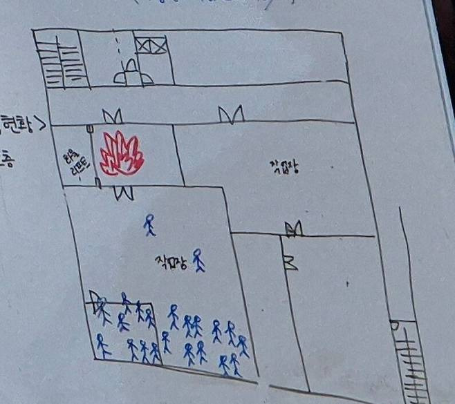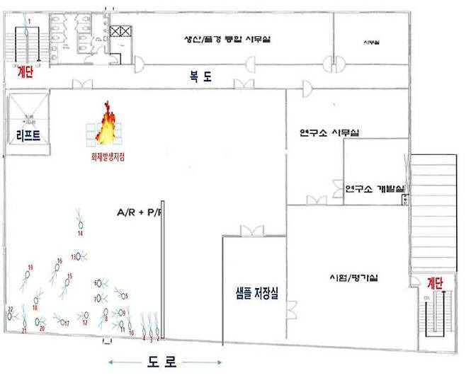 화재·폭발 위험이 상존하는 리튬 배터리를 별도 공간에서 관리했다면 희생자 규모를 줄일 수 있었다. 화재가 난 배터리 적재 장소가 작업장과 한 공간에 있어, 유독가스가 급격히 확산됐기 때문이다. 다만 변경 전 도면을 기준으로 보더라도 비상계단으로 향하는 경로 사이에 배터리 적재 장소가 있어, 이 역시도 적절한 대피 공간을 마련했다고 보긴 미흡하다.