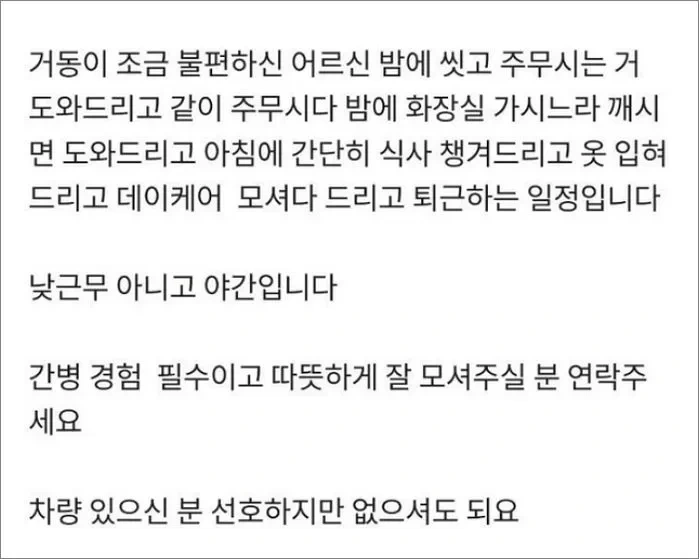 근무 시간은 월요일부터 토요일까지 오후 9시부터 다음 날 아침 9시까지다. 공고글 작성자는 "간병 경험 필수이고 따뜻하게 잘 모셔주실 분 연락 달라. 차량 있으신 분 선호하지만 없으셔도 된다"고 했다.