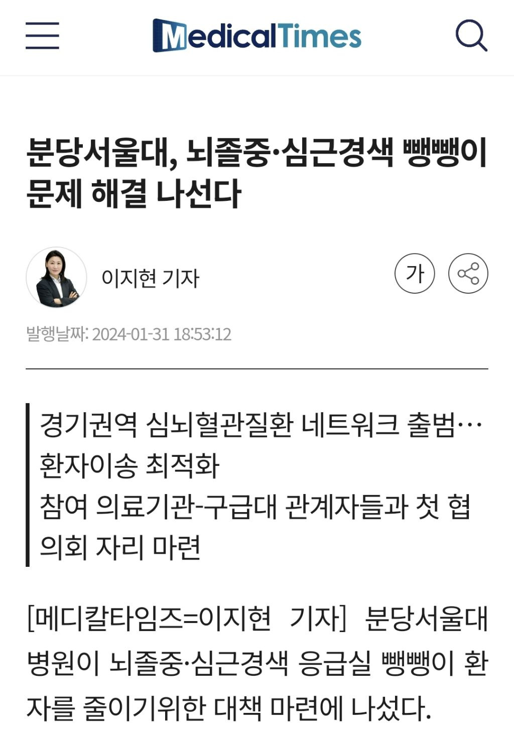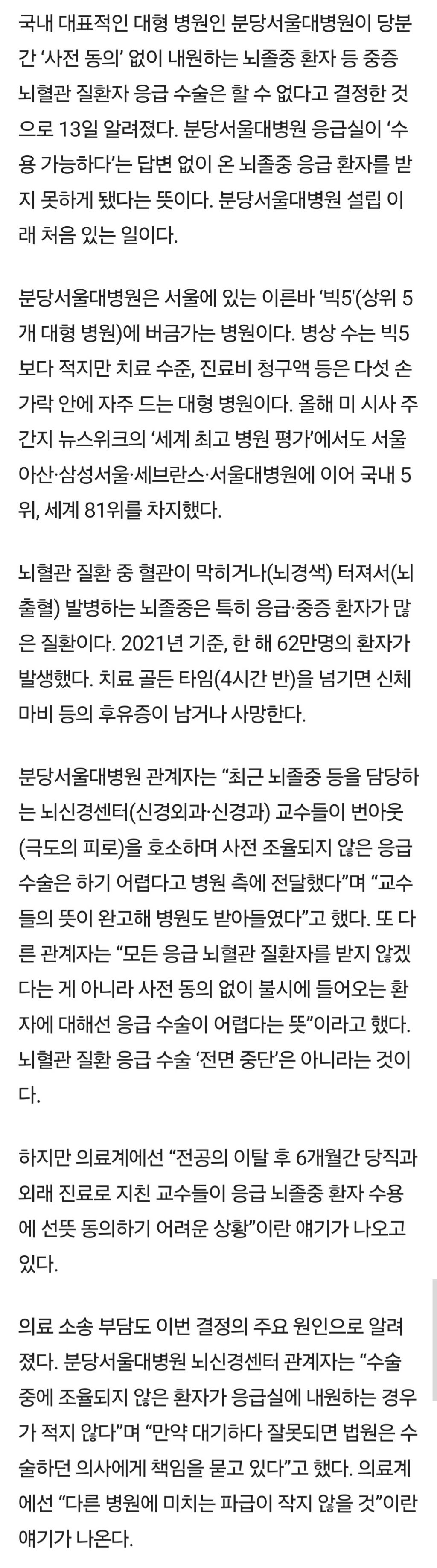 [단독] 분당서울대병원 "사전 조율 없는 뇌졸중 환자 수용하기 힘들다"