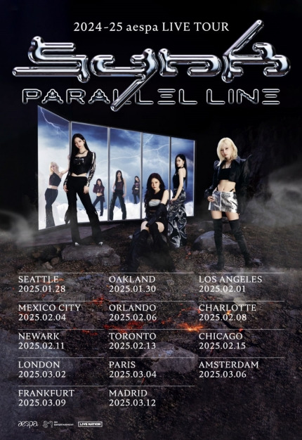 오늘(27일) 에스파 공식 팬클럽 커뮤니티 및 사회관계망서비스(SNS) 계정에는 ‘2024~2025 에스파 라이브 투어 - 싱크 : 패러렐 라인’(2024~2025 aespa LIVE TOUR - SYNK : PARALLEL LINE)의 포스터 이미지가 오픈, 한층 확장된 규모의 투어를 예고해 이목을 집중시켰다.