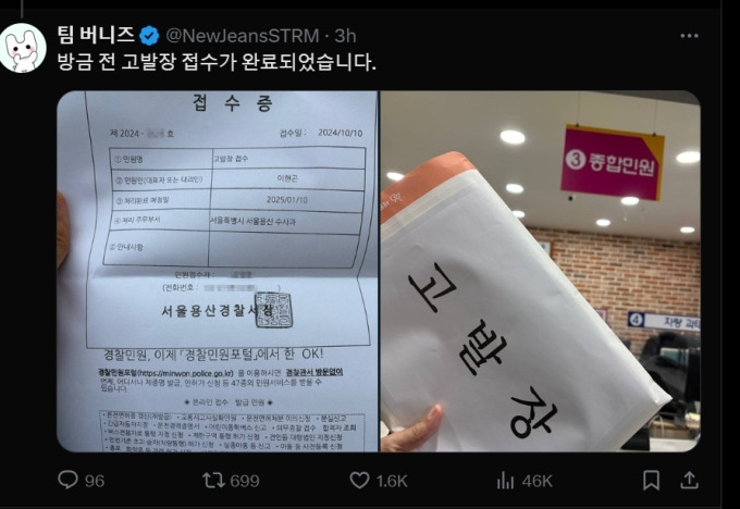 뉴진스 팬 '팀 버니즈'의 법률대리인 법률사무소 새올과 법률사무소 오페스는 10일 오전 11시 21분경 서울 용산경찰서에 김주영 어도어 대표이사, 이도경 부대표와 하이브 최고 홍보책임자, PR 홍보실장에 대한 고발장을 제출했다.
