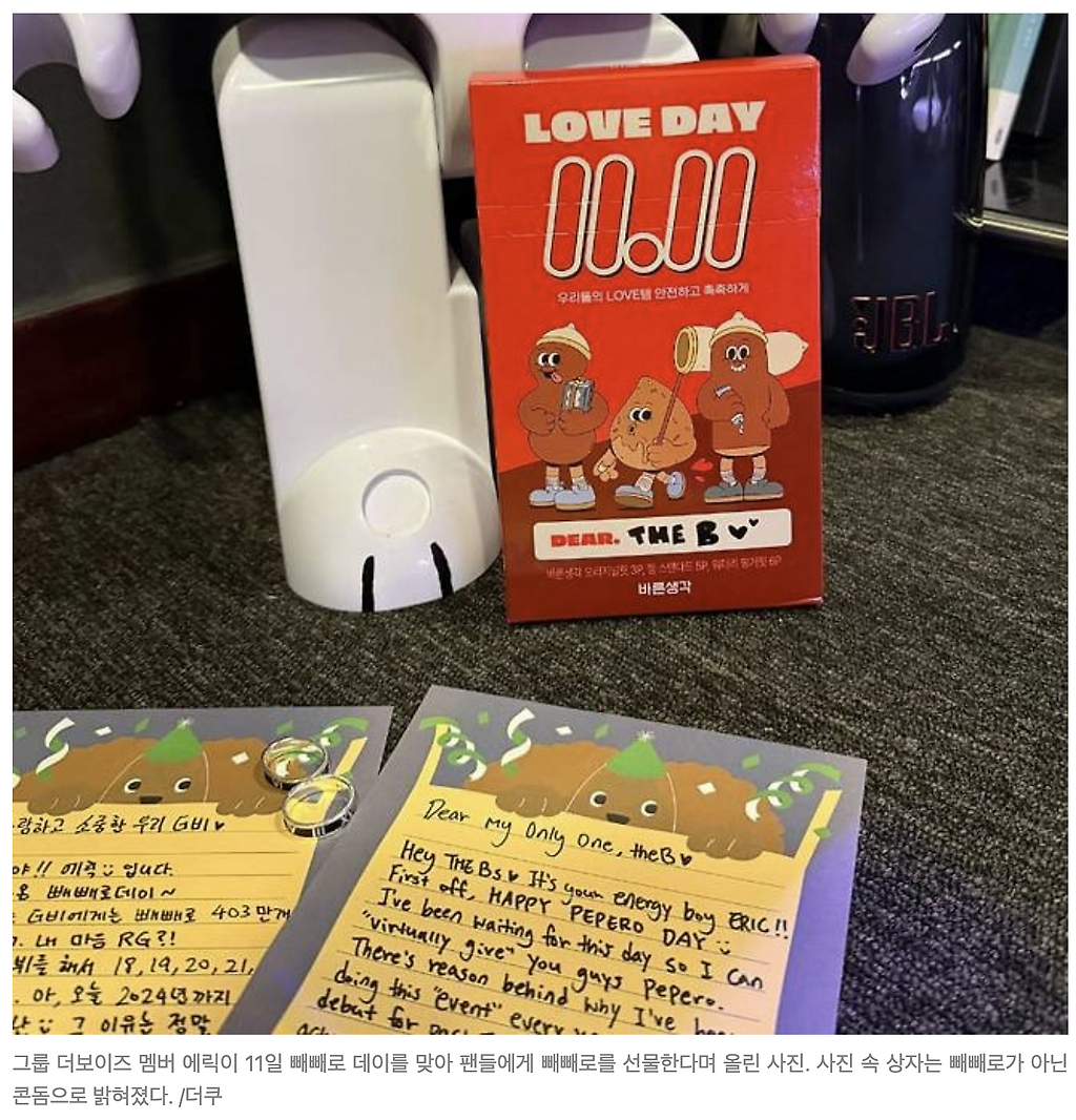 현재 원본 게시물은 삭제된 상태다. 해당 사진이 확산하자 에릭은 팬들에게 “나 솔직히 지금 너무 부끄럽고 창피해서 일주일 동안은 쥐구멍에 숨어 있으려고 한다”며 “오늘 퇴근하고 숙소 앞 편의점에 가서 밖에 빼빼로 진열되어 있는 곳에서 고른 것”이라고 했다. 이어 “그게 뭔지도 몰랐고 그런 거였는지도 정말 몰랐다”며 “많은 빼빼로가 있었지만 ‘Dear’라고 쓰여 있길래 더보이즈 팬송 ‘Dear’도 생각나고 빈칸에 ‘TheB’ 적으면 딱이겠다 생각해서 고른 거였다”며 “놀랐다면 미안하다”고 했다.