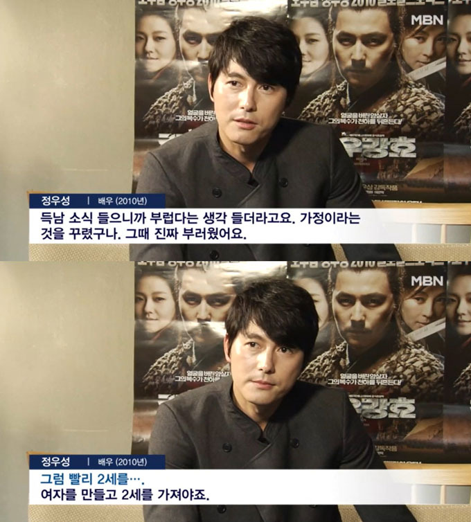 정우성은 '장동건과 고소영이 결혼해 득남도 했는데 부럽지 않냐'는 질문에 "결혼할 때는 부럽다는 생각이 없었는데 득남 소식을 들으니 부럽다는 생각이 들더라"며 "가정이라는 것을 꾸렸다는 것이 부러웠다"고 답했다.