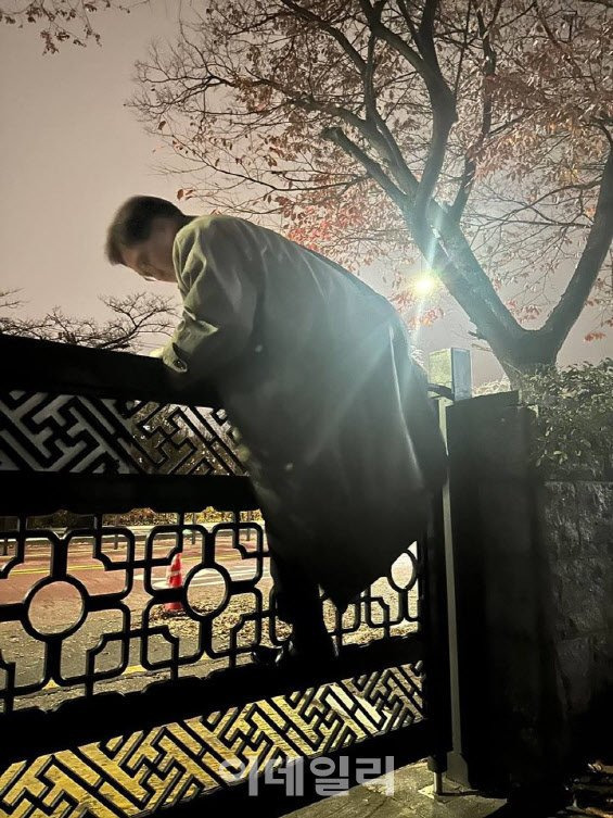 우원식 국회의장이 3일 오후 10시 57분경 국회 본회의에 참석하기 위해 국회 담을 넘고 있다.