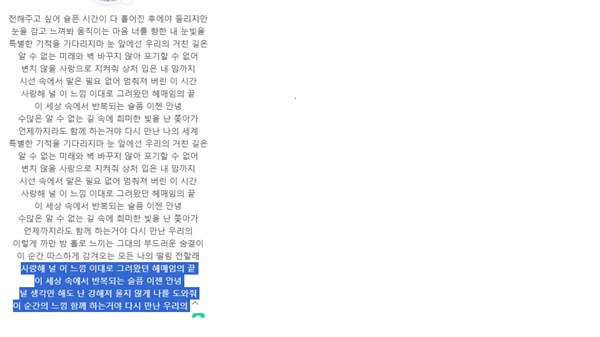 불안할 때, 힘이 필요할 때 많이 듣던 부분은 ' 이 세상 속에서 반복되는 슬픔 이제 안녕' 과 '널 생각만 해도 난 강해져 울지 않게 나를 도와줘 '였는데 이 부분을 속으로 되뇌면서 국가고시를 보던 기억이 아직도 생생하다.