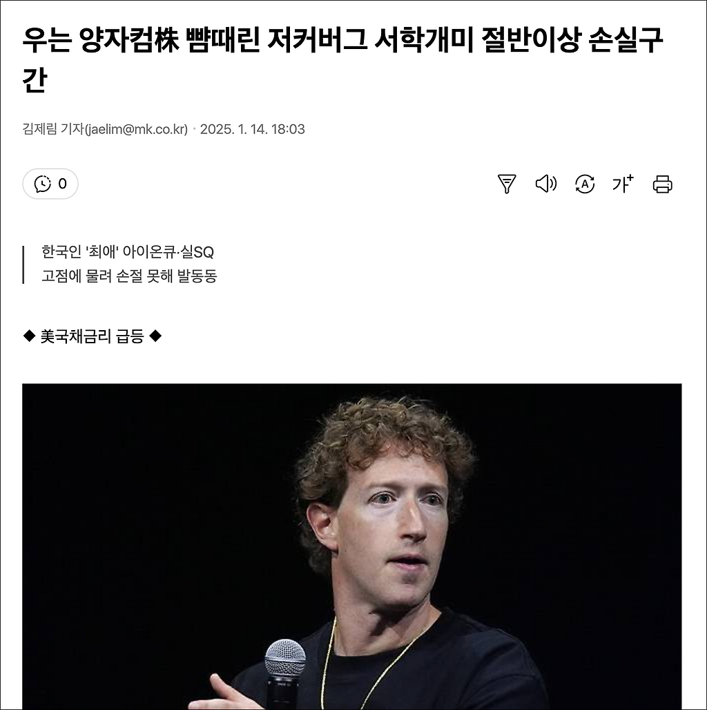 우는 양자컴株 뺨때린 저커버그 서학개미 절반이상 손실구간