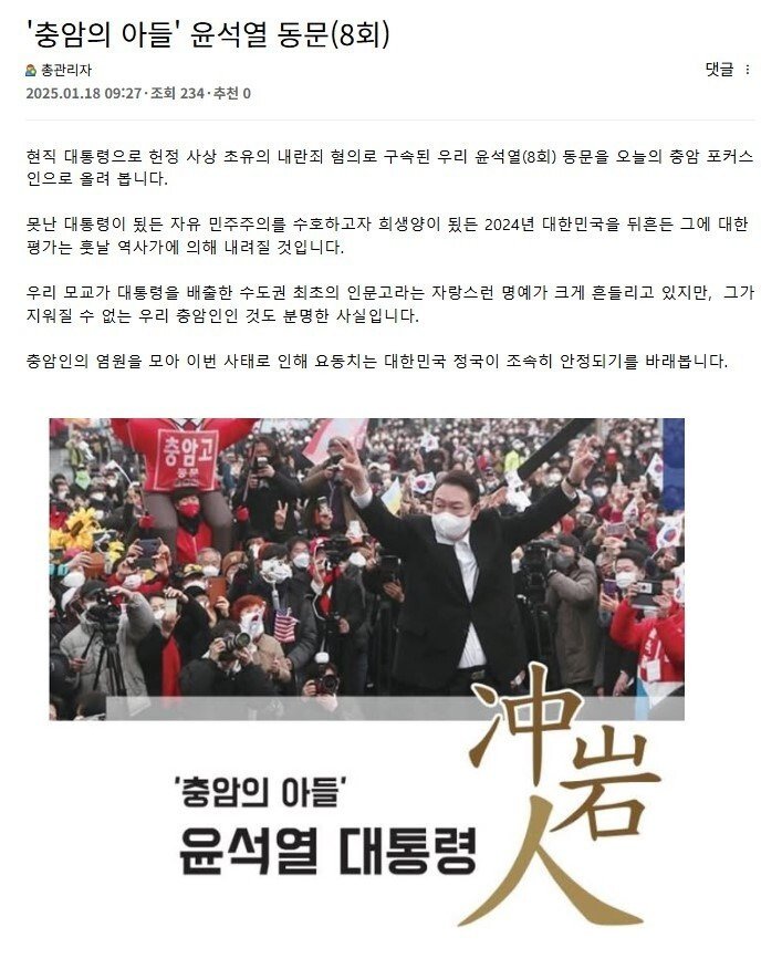충암고 총동문회 누리집 ‘포커스 충암인’ 게시판에는 지난 18일 오전 9시27분 총관리자 명의로 ‘충암의 아들 윤석열 동문(8회)’이라는 제목의 글이 올라왔다. 이날은 윤 대통령이 서울서부지법에서 구속 전 피의자심문(영장실질심사)에 출석한 날이다.