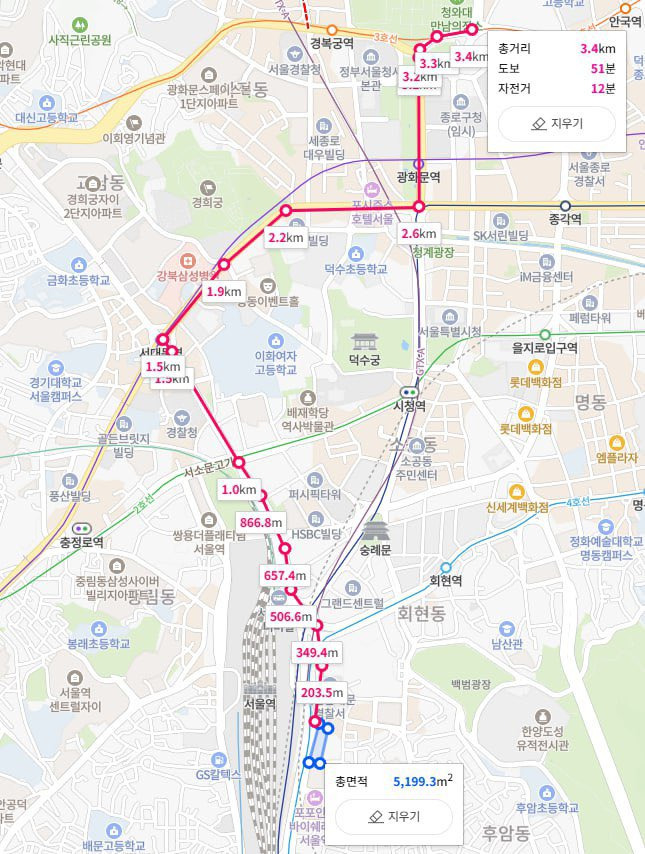 - 경유지 : 서울역→경찰청→서대문역사거리→세종대로사거리→광화문