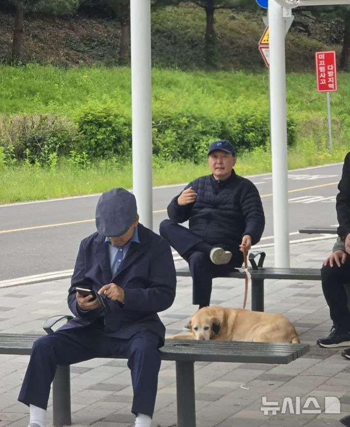 공개된 사진에는 운동복 차림으로 벤치에 앉아 반려견의 목줄을 잡고 있는 윤 전 대통령의 모습이 담겼다.