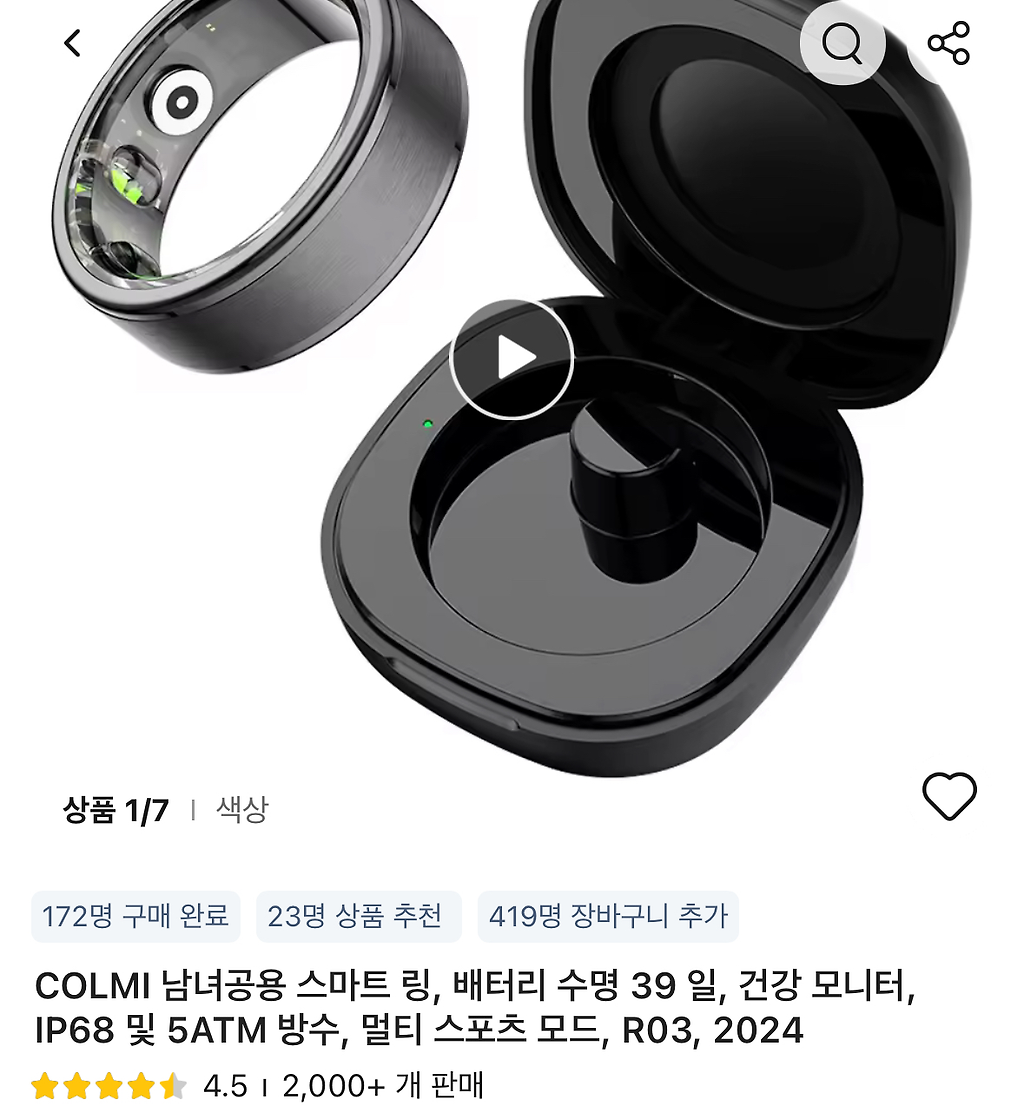 갤럭시링 궁금한데 아이폰쓰기도 하고 너무 비싸서 안 샀는데 천원마트에 뜨길래 샀어. 심박수 산소포화도 등등 크기 작은데 은근 꾸준히 측정해주고 좀 굵긴한데 스마트밴드류보다는 손목이 덜 불편해서 잘 썼었어. 나는 충전케이스 같이 있는 제품으로 샀고, 애플 건강앱이랑 연동 됐음. 방수된다는데 좀 불안해서 손 씻을 때마다 빼고 끼고 했는데 그건 좀 번거로울듯? 처음엔 배터리 소모 빨라서 의아했는데 한두번 소모 빠르더니 나중엔 오래갔어. 구매가 11.07달러