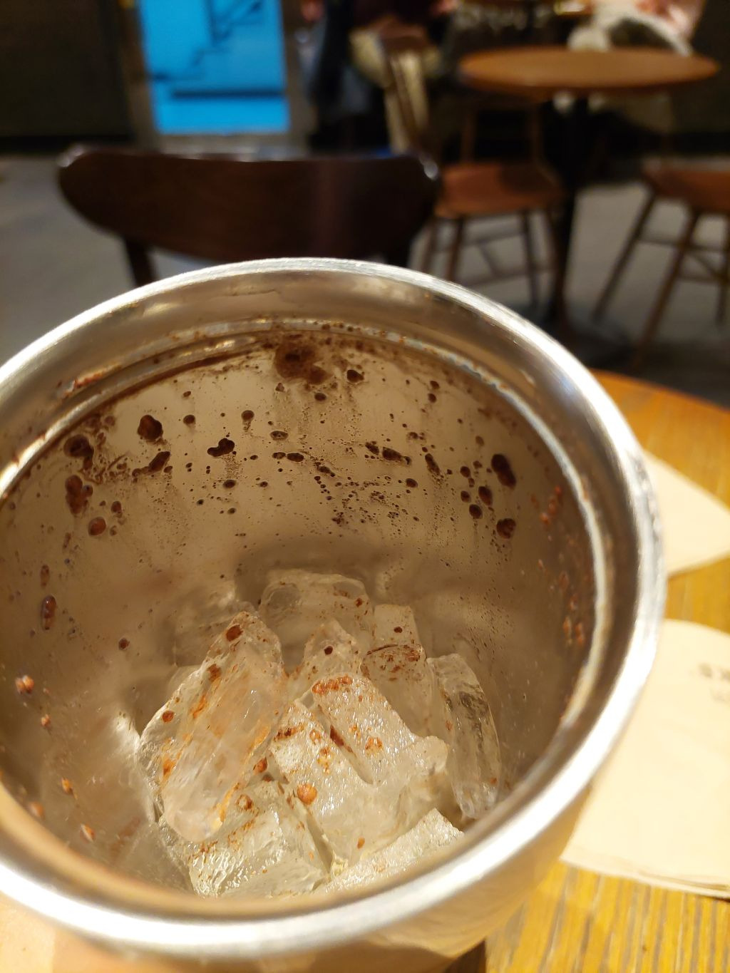 한시간 넘게 얼음 녹고 빨대로저어 녹이고 남은양이야거야벤티 텀블러 아이스라떼얼음양ㅋㅋ참고로 스벅벤티는샷2개로 그란떼보다 우유양이 더 들어가는건데얼음양 보면 우유양 의문이다ㅋㅋ1/4공간외다 얼음임 애초에 샷2개가 에바