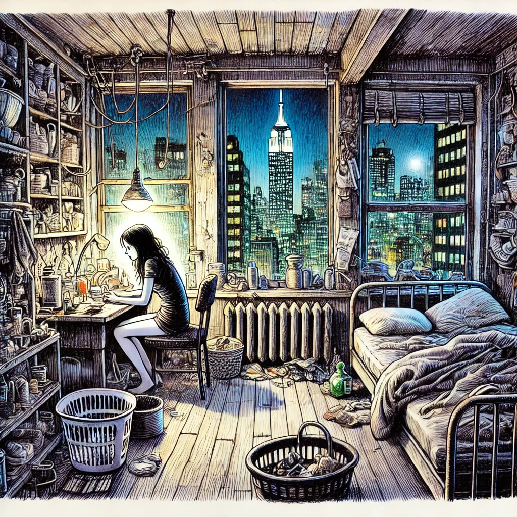 pen and ink, illustrated by hergé, a lonely woman inside her cramped and messy NYC apartment with big windows overlooking the city at night. Sadness, stunning color scheme, masterpiece