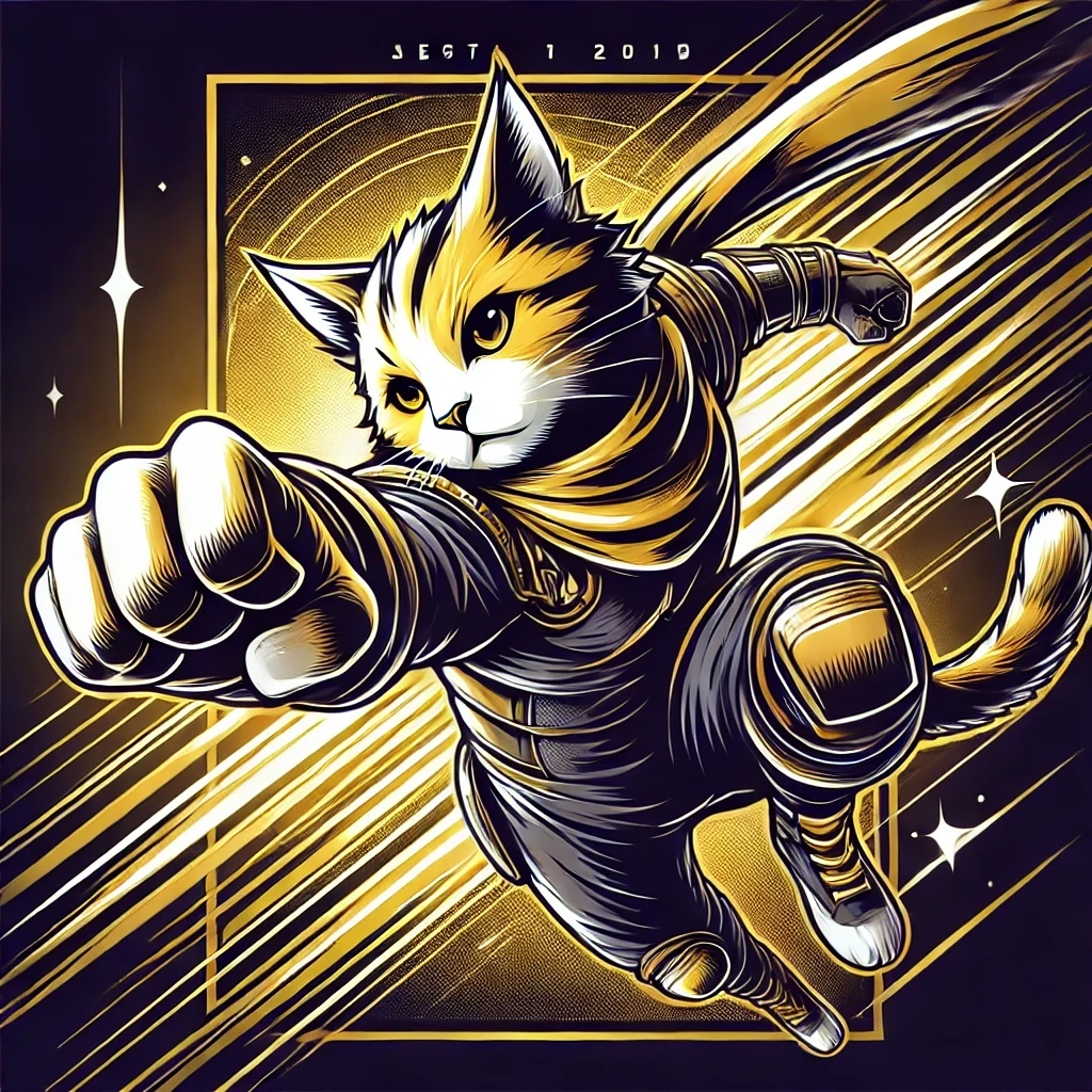 댓글 0cat in an action pose, with a vector art style and a gold and black color scheme, dramatic lighting, detailed background elements, a dynamic angle, bold lines, high contrast, anime artwork, high resolution, high detail, vibrant colors, an energetic atmosphere