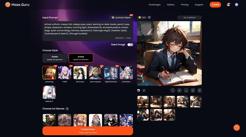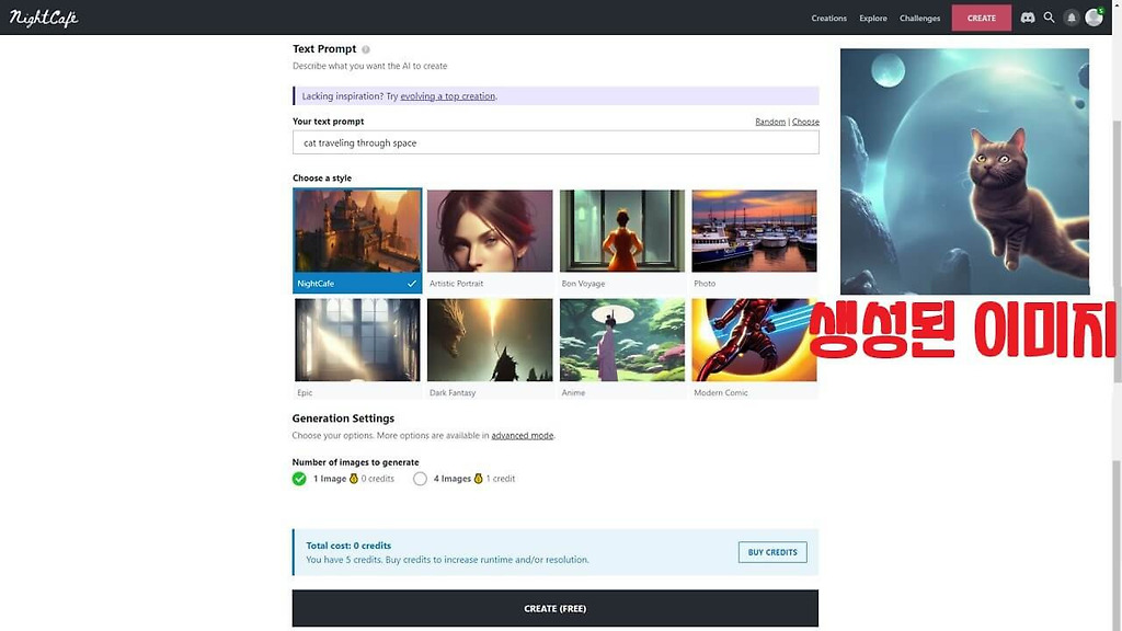 나이트카페 AI 아트 제너레이터는 Stable Diffusion, DALL E 2 등등 여러 AI 생성기를 기반으로 제작된 웹사이트로 일부 기능을 무료로 사용할 수 있습니다. Your text prompt에 원하는 그림의 이미지를 표현하는 텍스트를 입력한 후 CREATE을 클릭해 그림을 생성하는 텍스트 투 이미지 기능을 이용하실 수 있습니다. 또한 매일 특정한 주제의 AI 그림을 생성하는 챌린지에 참여해 우승을 목표로 도전하는 재미도 있습니다.