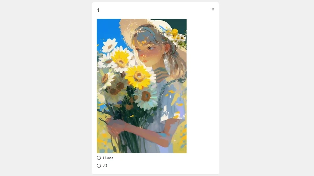 Human or AI는 인공지능이 그린 그림인지를 추측하는 설문조사 방식의 사이트입니다. 총 30문항이 준비되어있으며 사람이 그린 것인지 AI가 그린 것인지를 추측한 후 체크하는 방식으로 진행되며 30문항을 모두 체크한 후 정답을 확인할 수 있습니다. 자신의 눈썰미를 테스트해보고 싶은 분들에게 추천합니다.