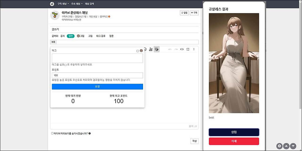 단, 이미지를 한번 생성할 때 최소 500포인트가 필요하고, 포인트를 얻기 위해서는 글쓰기와 댓글 쓰기 활동을 해야 하기에 평소 아카라이브에서 활발하게 활동하시는 분이 아니라면 추천하기는 힘들 것 같습니다.