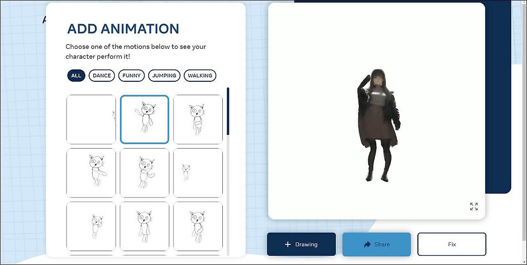 애니메이션 드로잉은 자신이 그린 간단한 그림을 사이트에 업로드해 움짤 이미지를 만들 수 있는 플랫폼입니다. 그림 업로드 > 관절 설정 > 모션 설정 순으로 진행되며 WebUI나 미드저니 같이 AI가 생성한 그림이라도 전신이 나온다면 사용할 수 있습니다. 웃으꽝스러운 모습으로 움직이는 캐릭터를 보고싶다면 한번 사용해보세요.