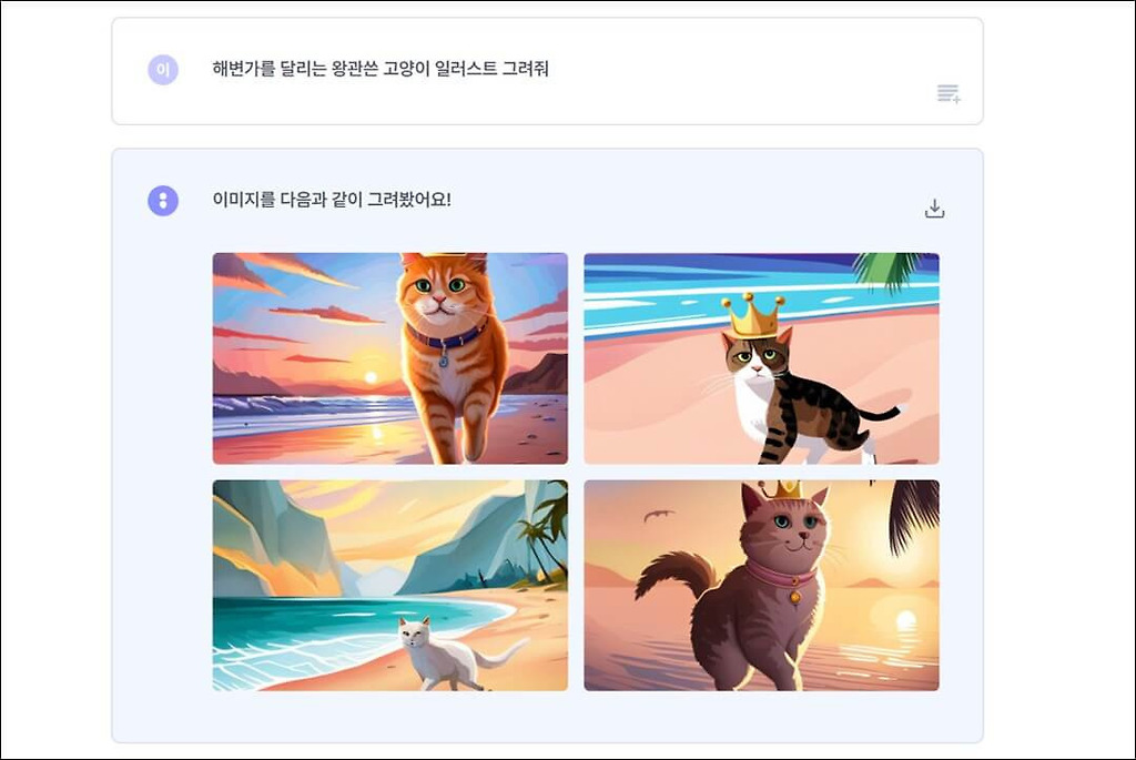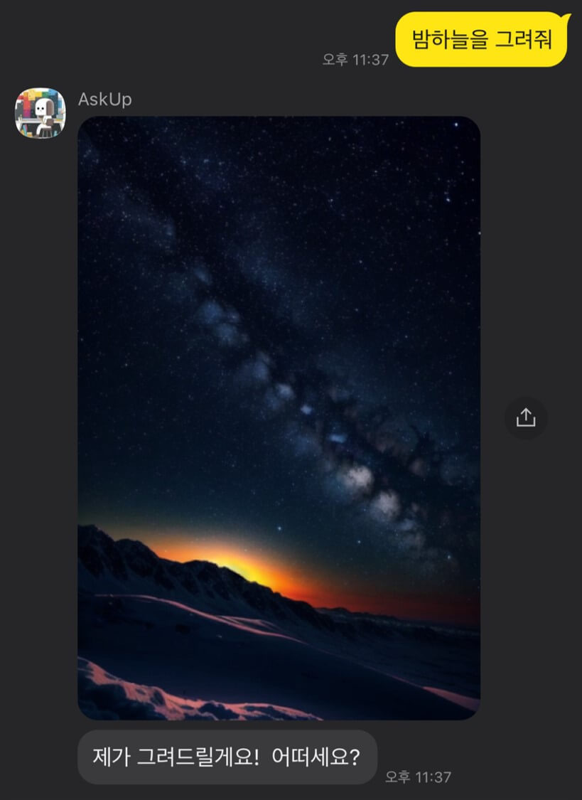 최근 업데이트로 AI가 그림을 그려주는 업스케치 기능도 베타서비스로 운영 중으로 채팅에서 업스케치 베타 신청을 클릭해 해당 기능을 활성화한 후 ~를 그려줘라고 입력해 이미지를 생성할 수 있습니다.