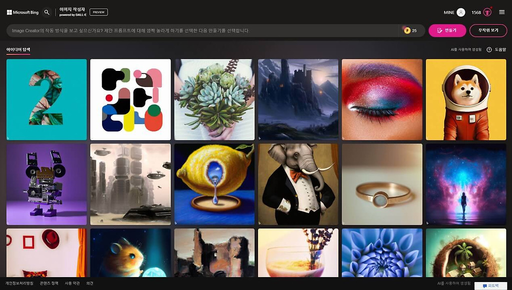 빙 이미지 크리에이터는 오픈 AI의 이미지 생성 AI 프로그램 달리(DALL-E)를 기반으로 제작된 인공지능 그림 사이트로 메인 홈페이지에서 다른 사람들이 생성한 멋진 이미지들을 확인할 수 있고, 검색 란에 생성하고 싶은 그림을 표현하는 프롬프트를 입력해 이미지를 생성할 수 있습니다.