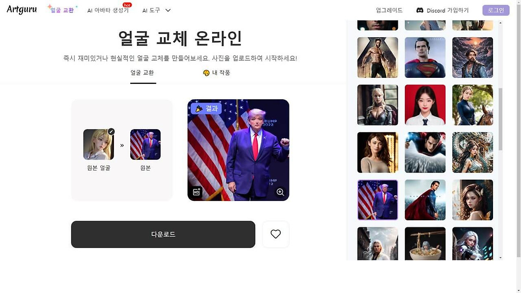 AI 얼굴 바꾸기 사이트에서는 자신의 얼굴 혹은 게임 캐릭터 얼굴과 사이트에서 제공하는 원본 이미지와 합성할 수 있는 기능을 제공합니다. 슈퍼 히어로, 대통령, 아름다운 배경에 서 있는 사진 등 다양한 의상 및 배경을 무대로 자신의 얼굴을 합성하며 재미있는 시간을 보내보세요.