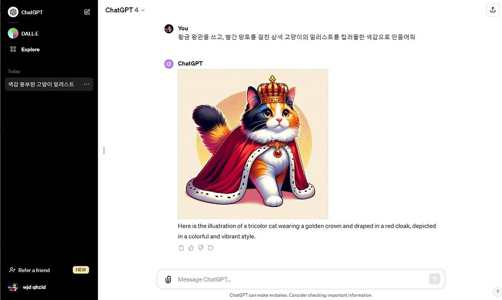 ChatGPT 4 모델을 선택하거나 DALL 카테고리를 선택해 새로운 방을 생성하고, “~한 형태의 그림을 그려주세요”와 같이 대화하듯 그림을 만들 수 있다는 특징이 있습니다. 또한 “16:9 비율로 그려줘”와 같이 비율을 지정하거나 이미 생성된 그림에서 “~부분을 변경해 줘”와 같이 특정 부분만 변경하는 것도 가능합니다.