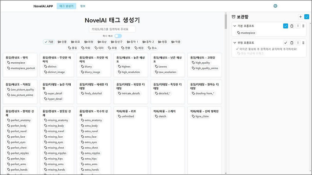 NovelAI 태그 생성기는 인공지능 이미지를 생성할 수 있는 사이트는 아니지만 AI 그림 생성을 위해 필요한 프롬프트를 만드는데 큰 도움이 되는 사이트입니다. 기본, 인물, 외모, 체형, 의상, 장신구, 동작, 행동 등을 선택해 보관함에 추가할 수 있고, 복사 버튼을 눌러 간단하게 본인이 생성하고 싶은 프롬프트를 제작하고, 복사해 사용할 수 있습니다.