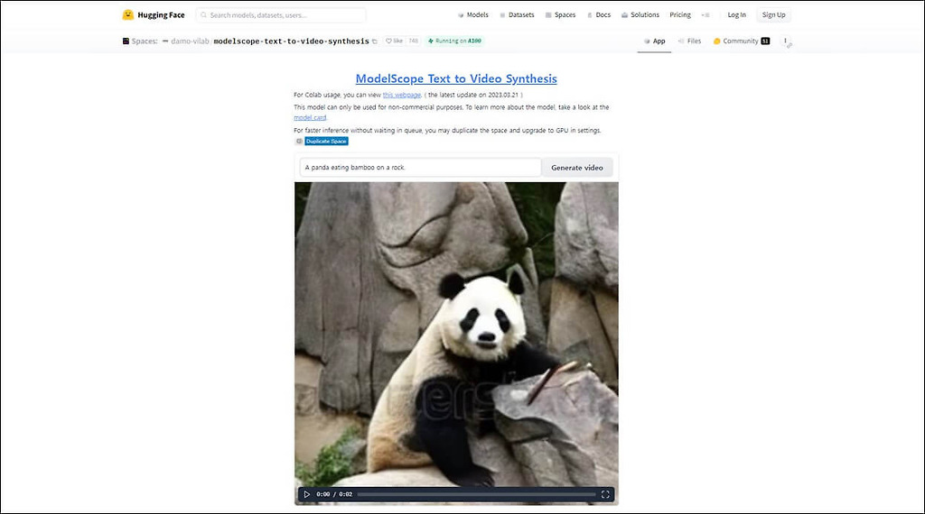 허깅 페이스는 스테이블 디퓨전 모델 배포로 유명한 사이트 중 하나로 다양한 AI모델을 다운로드 받을 수 있습니다. 3월 21일 공개된 text to video 오픈소스 모델인 ModelScope을 활용해 제작되었으며 사이트에 접속 후 영어로 제작하고 싶은 영상의 키워드를 입력해 생성할 수 있습니다.