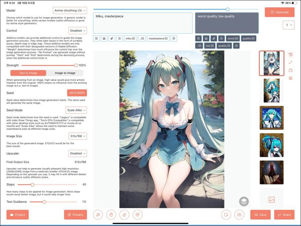 단, 모바일 GPU로 그림을 생성하는 것이기에 PC나 인공지능 그림 사이트에 비해 생성 속도가 느리고, 선택한 모델에 따라 그림의 퀄리티가 낮게 나오는 경우도 종종 있습니다.