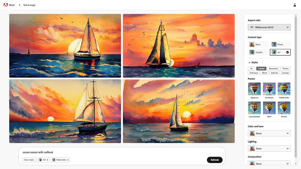 또한, AI 학습에 사용한 이미지와 데이터를 만든 제작자들에게 보상하고, 이미지를 사용할 때마다 제작자에게 로열티를 지급할 계획이라 발표하며 큰 호응을 얻었습니다. 모든 스타일, 사진, 예술, 디지털, 3D, 스타일 없음 선택할 수 있고, 생성하고 싶은 이미지를 표현하는 프롬프트를 입력해 그림을 생성할 수 있습니다.