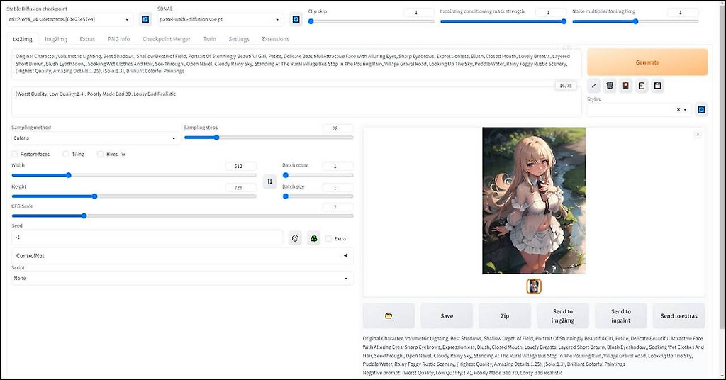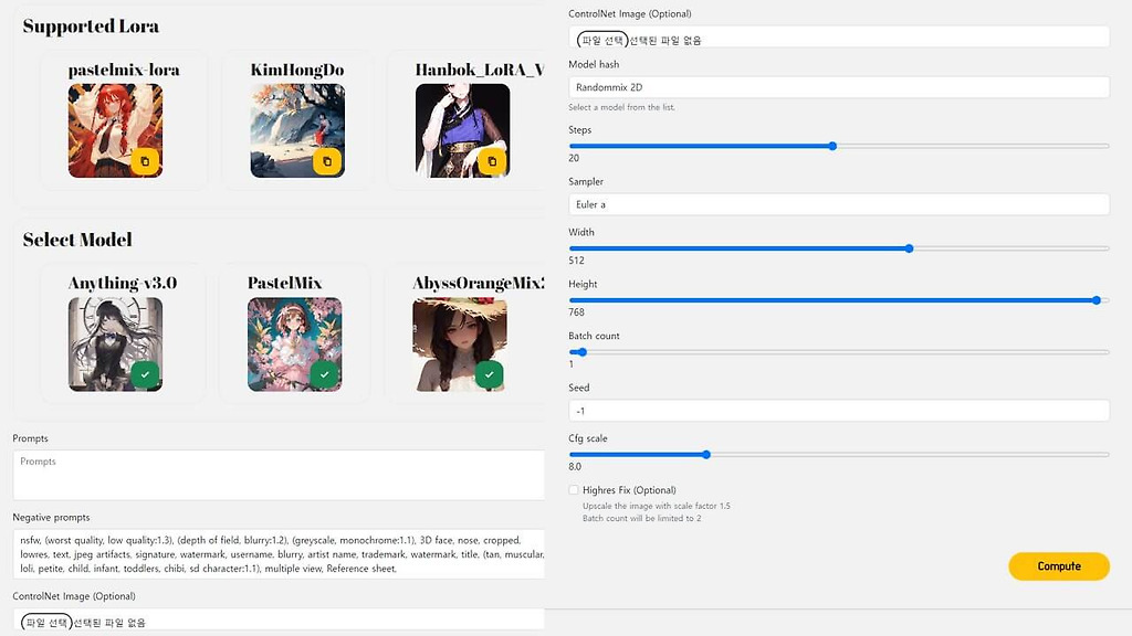 생성 기능은 로그인 후에만 이용 가능하고, Generate(생성) 버튼을 눌러 이동할 수 있습니다. 상단에서 사용할 모델을 선택하고, 원한다면 특정 캐릭터에 특화된 lora도 선택할 수 있습니다. 다음으로 프롬프트, 거부 프롬프트, 샘플러 등을 입력한 후 Compute 버튼을 클릭해 기다리면 그림이 생성됩니다.