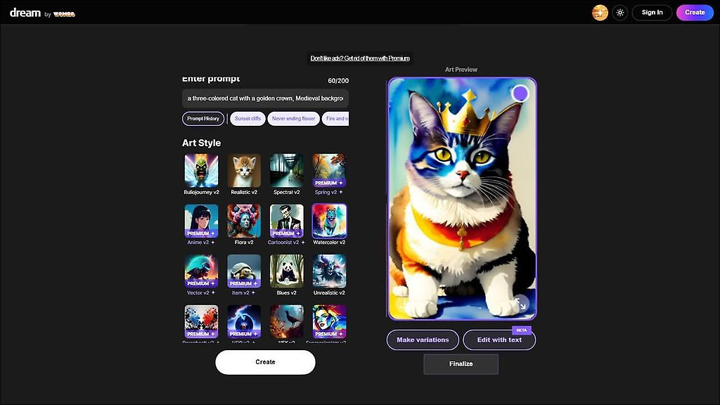 Wombo Art는 무료로 사용할 수 있는 AI 그림 사이트로 영어로 키워드를 입력하고, 좌측에서 테마를 선택한 후 Create 버튼을 눌러 입력한 키워드와 테마에 맞는 그림을 생성할 수 있습니다.